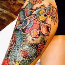 See more ideas about tattoos for women leg tattoos tattoos. Sep 4 2019 - Explore Normas board Dragon thigh tattoo followed by 7772 people on Pinterest. Dragon tattoo along with some feminine designs like cherry blossom blend well on a womans body.