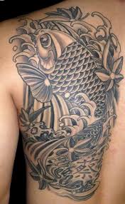 Again its a black koi fish which most likely means that the lady has overcome a challenge in their life recently at least if they got it for the traditional reason. The upper part of the back is another suitable place for wearing koi fish tattoos. Koi tattoos can look very intricate as well and are comprised of arches scales and delicate curves.